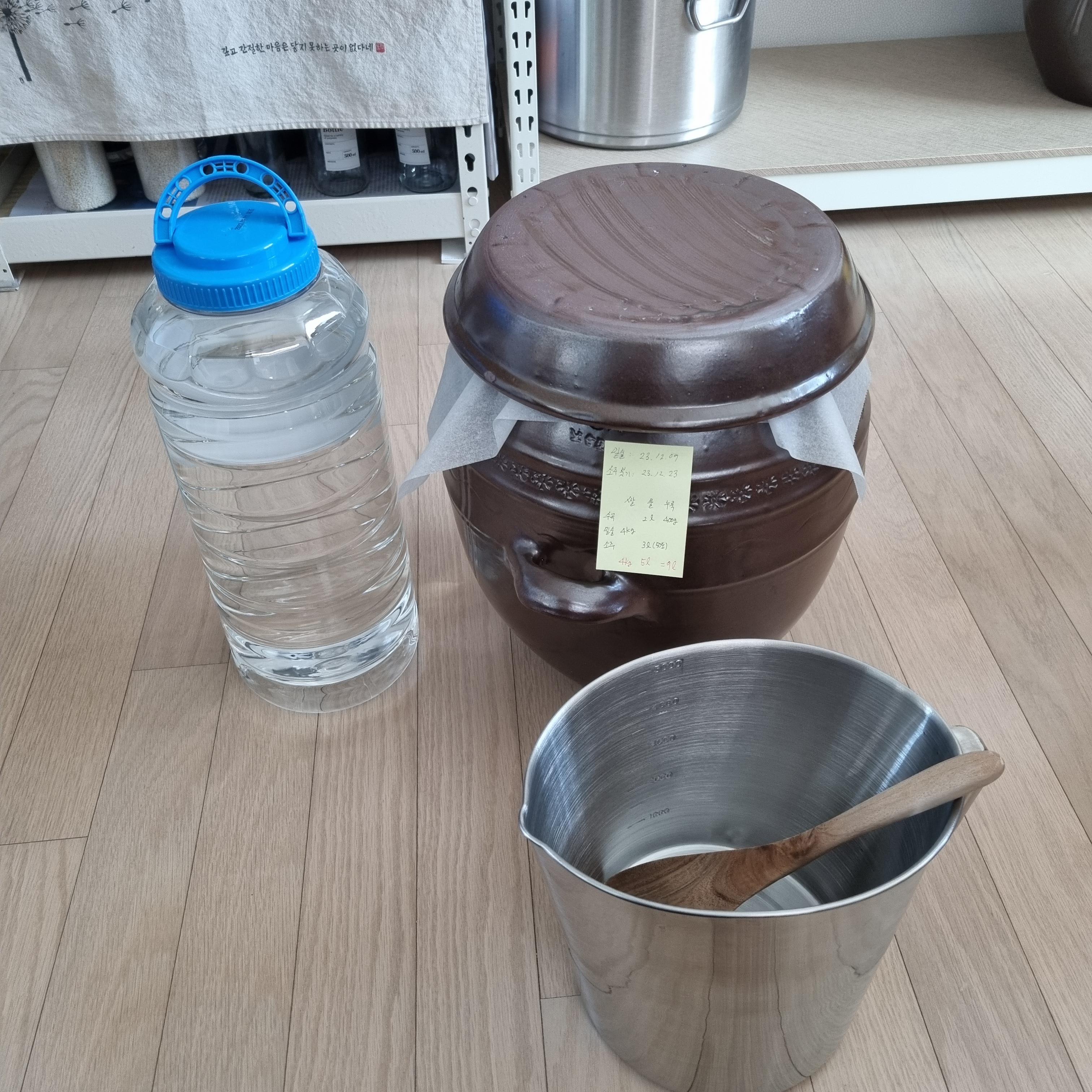 오늘의 준비물은 사진과 같이 별로 없다. 과하주에 소주를 넣는 건 생각보다 간단하다. 밑술 후 3~5일 이내에 뚜껑을 열고, 소주를 부은 다음 휙휙 저어주면 끝이다. 한 가지 계산해야 되는 것이 있는데, 그것은 바로 '몇도짜리 술을 얼마나 넣을 것이냐?'이다. 계산하는 공식은 간단하다. 아래에 자세히 설명해 놓겠다.