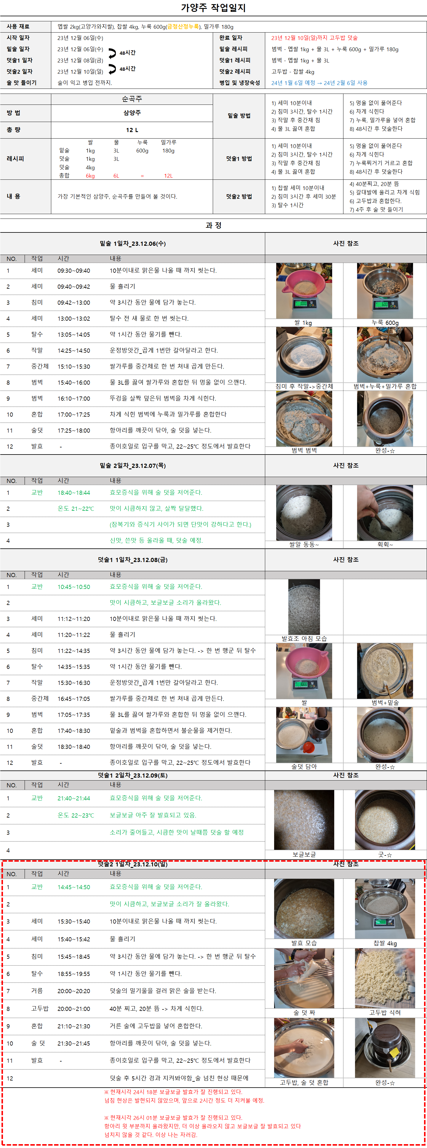 | 술 덧 | 21:30~21:45 | 항아리를 깨끗이 닦아, 술 덧을 넣는다. |