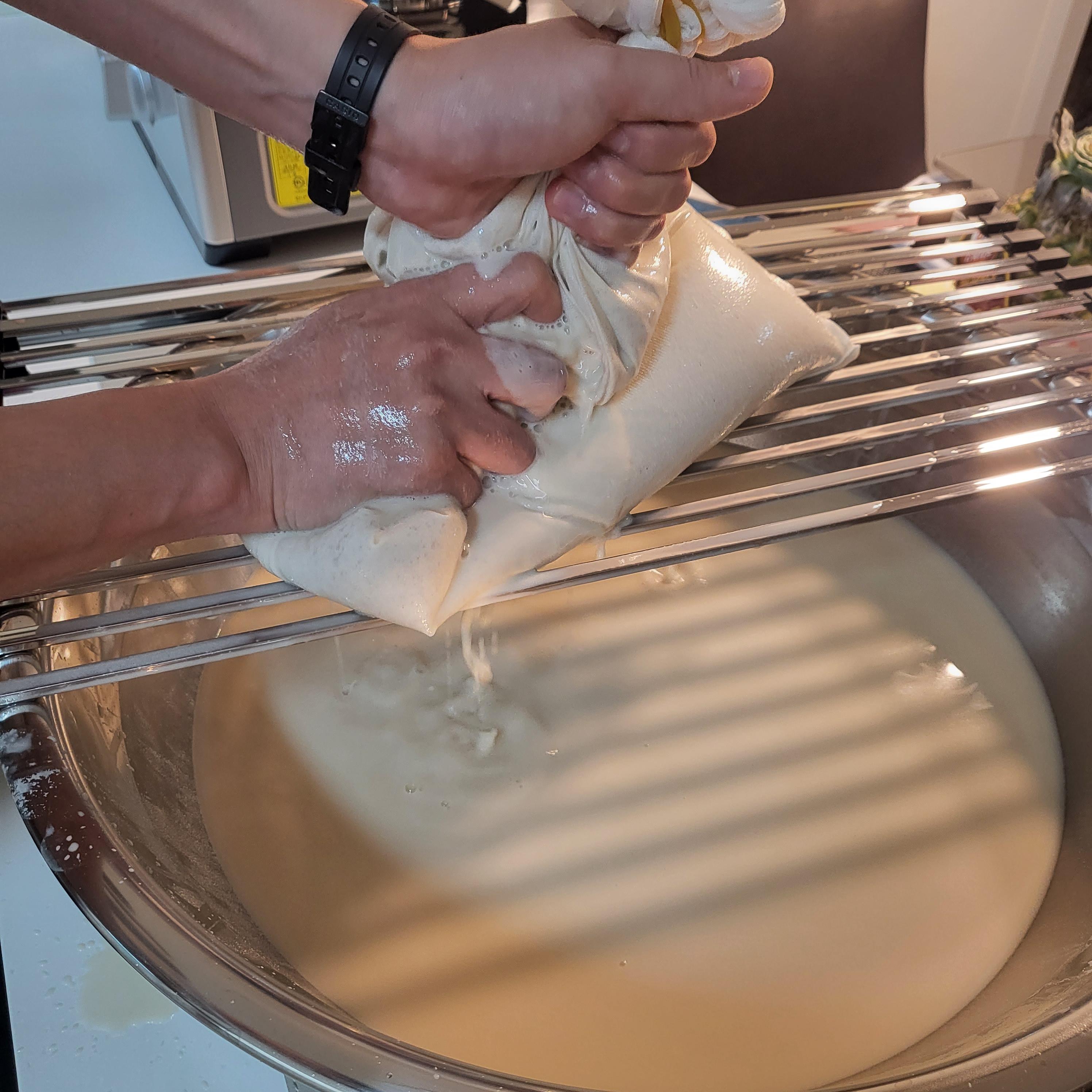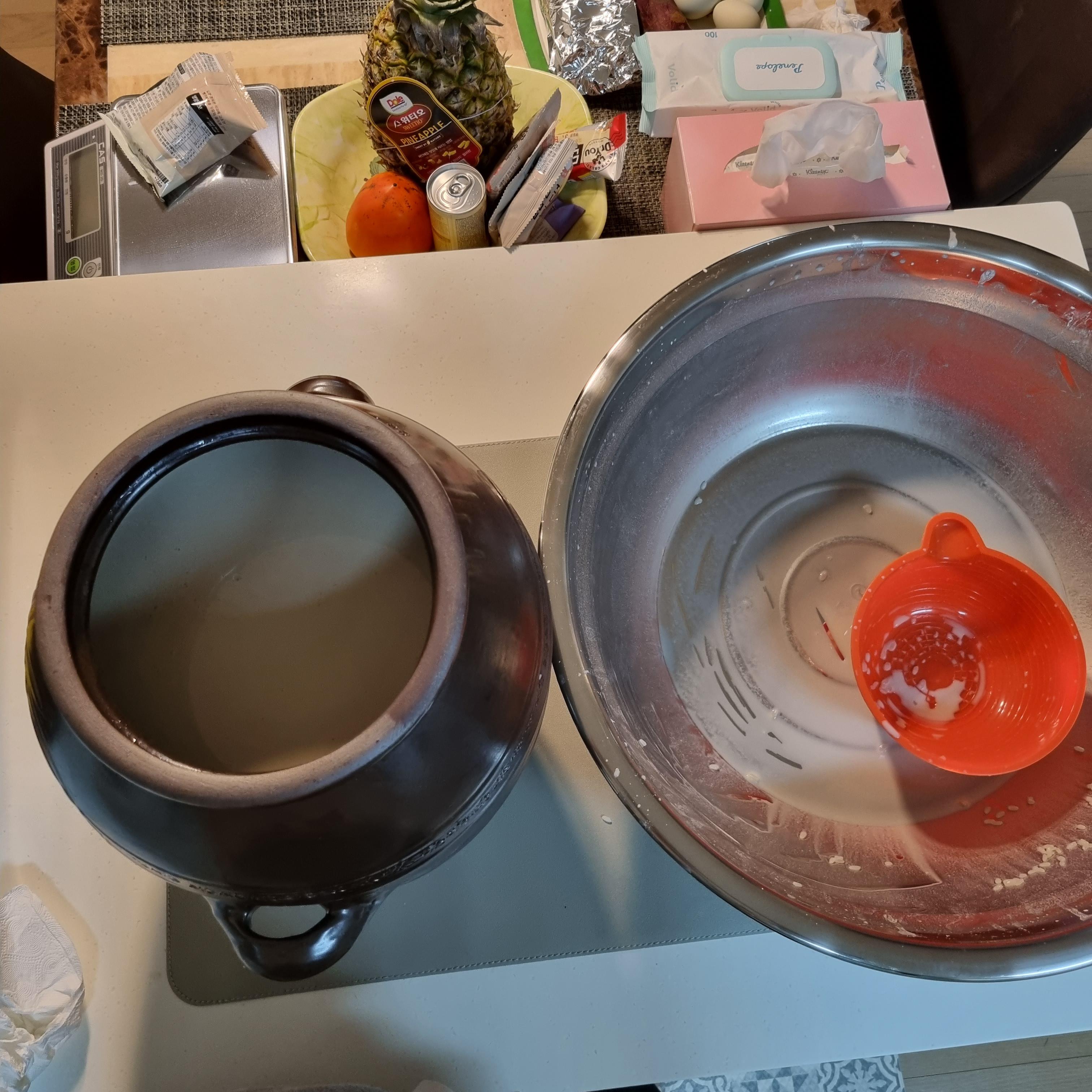 2. 고두밥이 쪄질 동안 덧술의 밀기울을 걸러 맑은 술을 받는다.