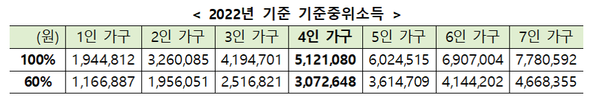 - 23년도에 중위소득이 바뀌면 어떻게 되나요? 신청년도 기준 중위소득이 적용되므로, 22년도에 신청하셨으면 22년도 중위소득기준을 참조하시면 됩니다.